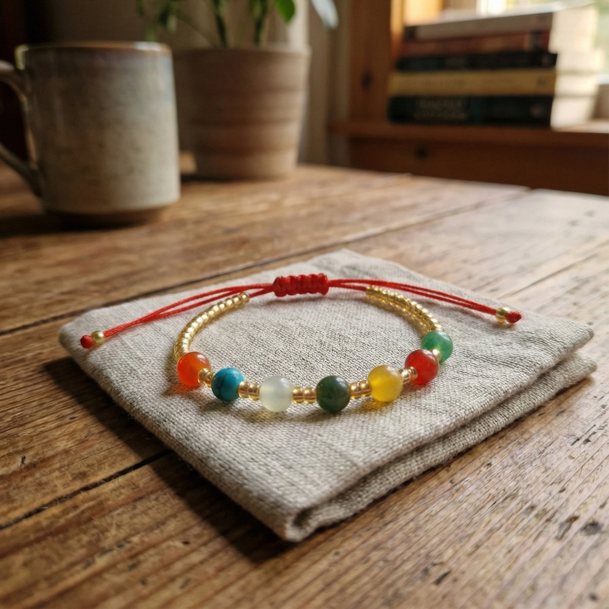 Item NameRed Cord Multi-Gemstone Bracelet with Gold Beads - Jade, Turquoise, Carnelian & Onyx