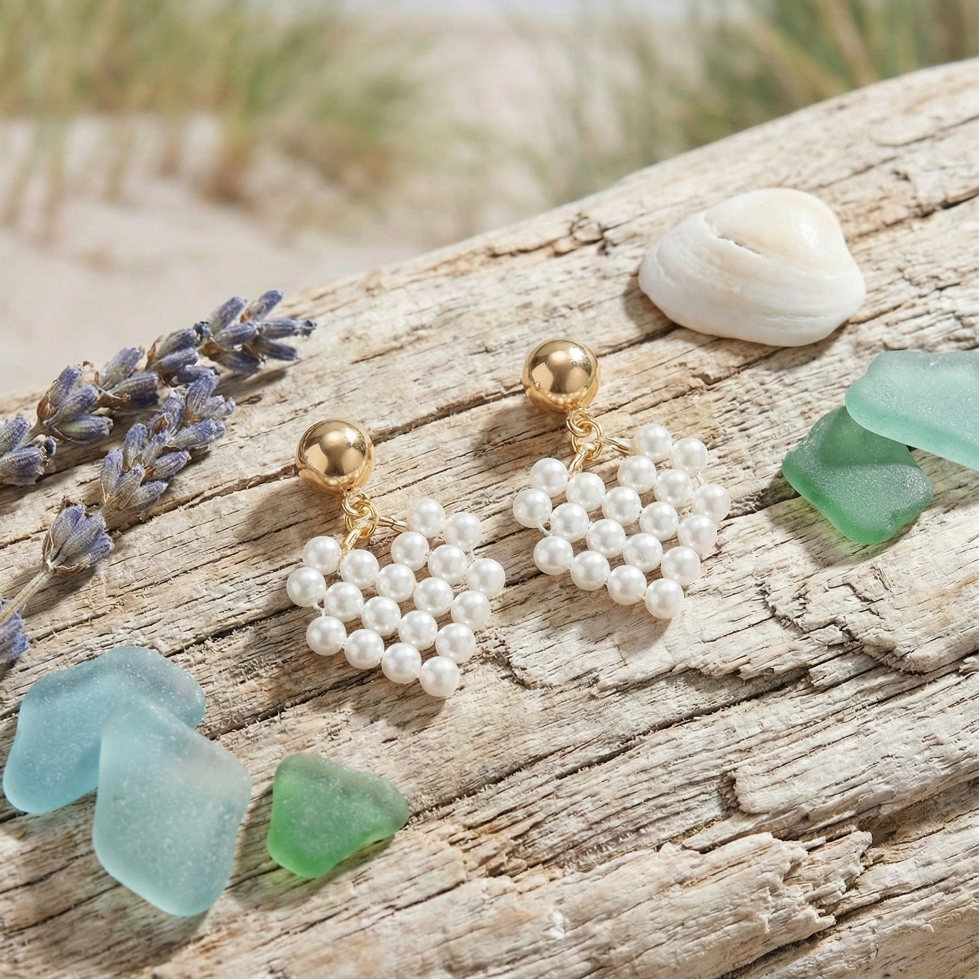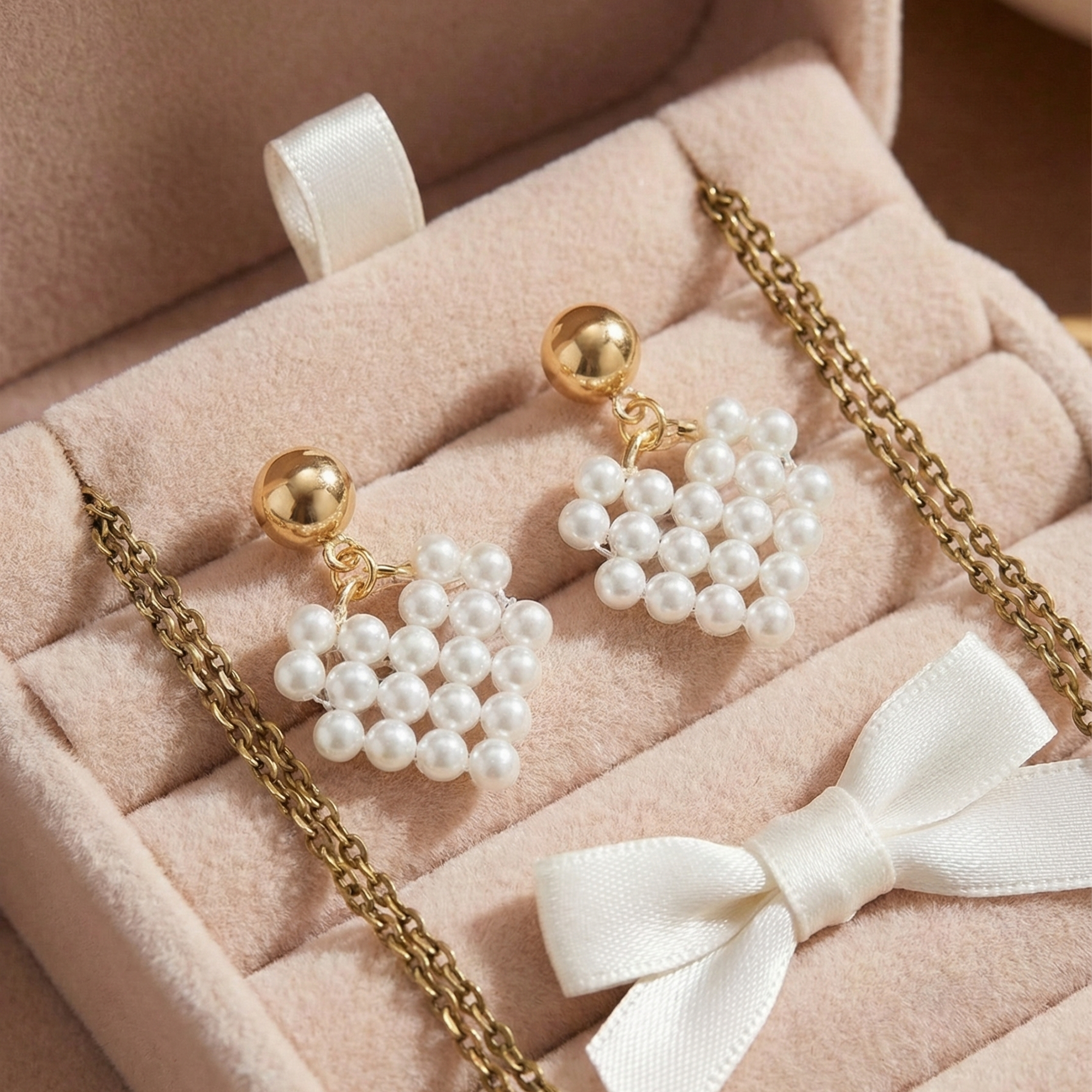 | Item Name | White Beaded Cluster Drop Earrings with Gold-Tone Studs |
