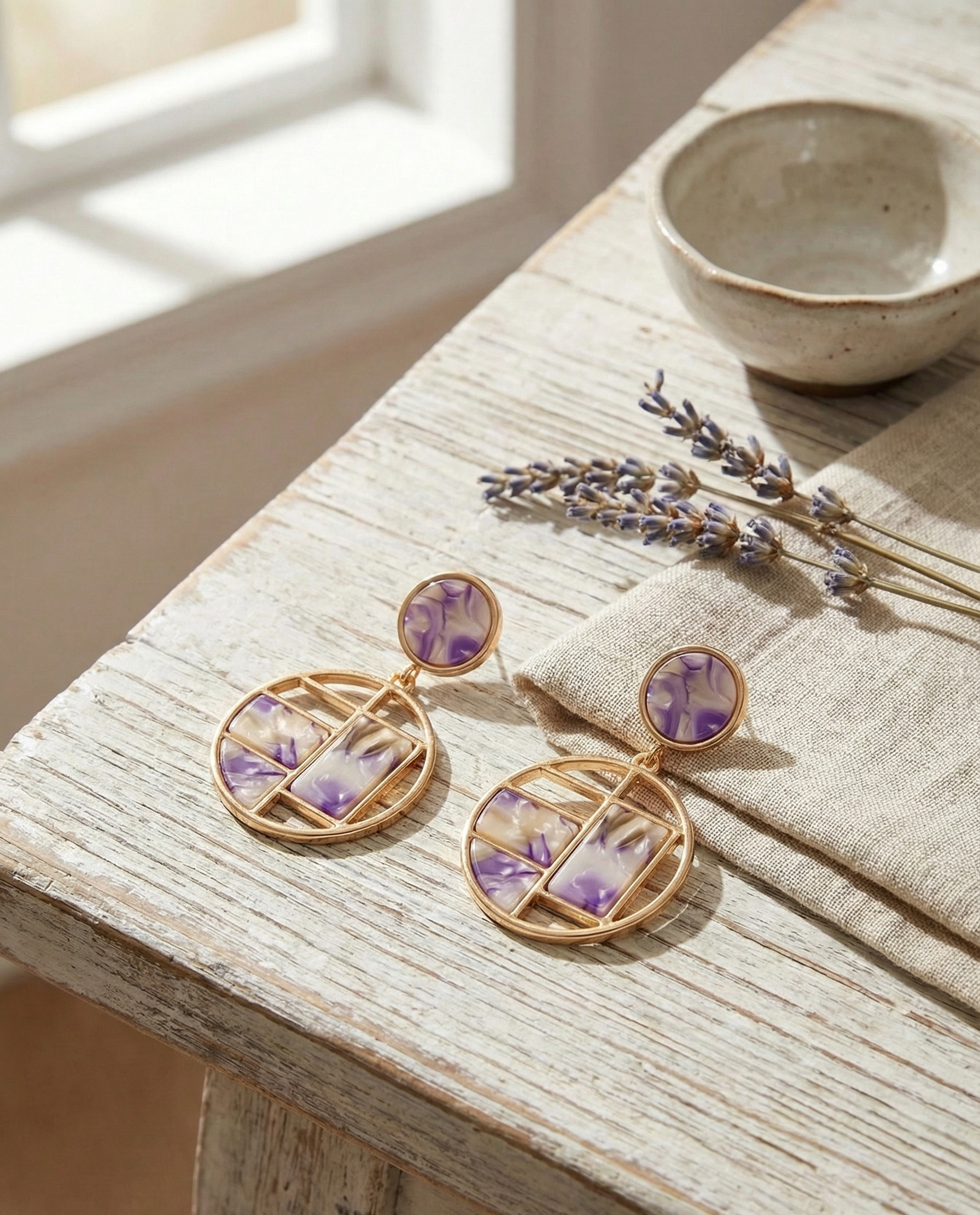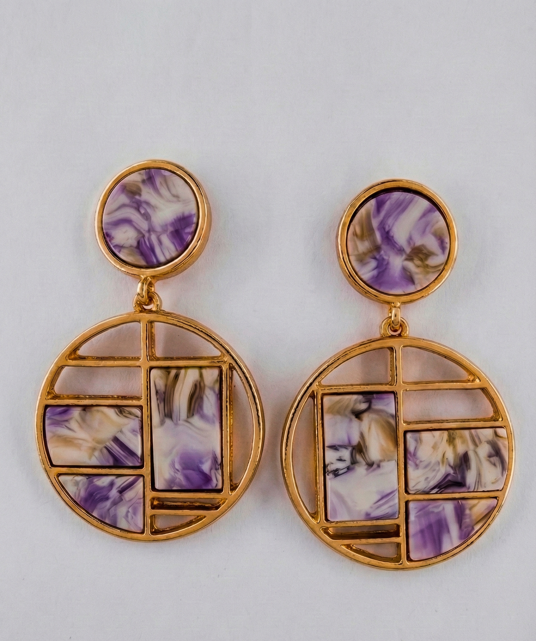 These artistic drop earrings from OMID Luxury Lifestyle Accessories blend modern geometry with a classic marble aesthetic. The design features a circular stud that suspends a larger, open-circle drop. The bottom hoop is intricately divided by a gold-tone grid, filled with panels of smooth, white and grey marbled resin. This "stained glass" style structure offers a contemporary, architectural look that is both lightweight and stylish.