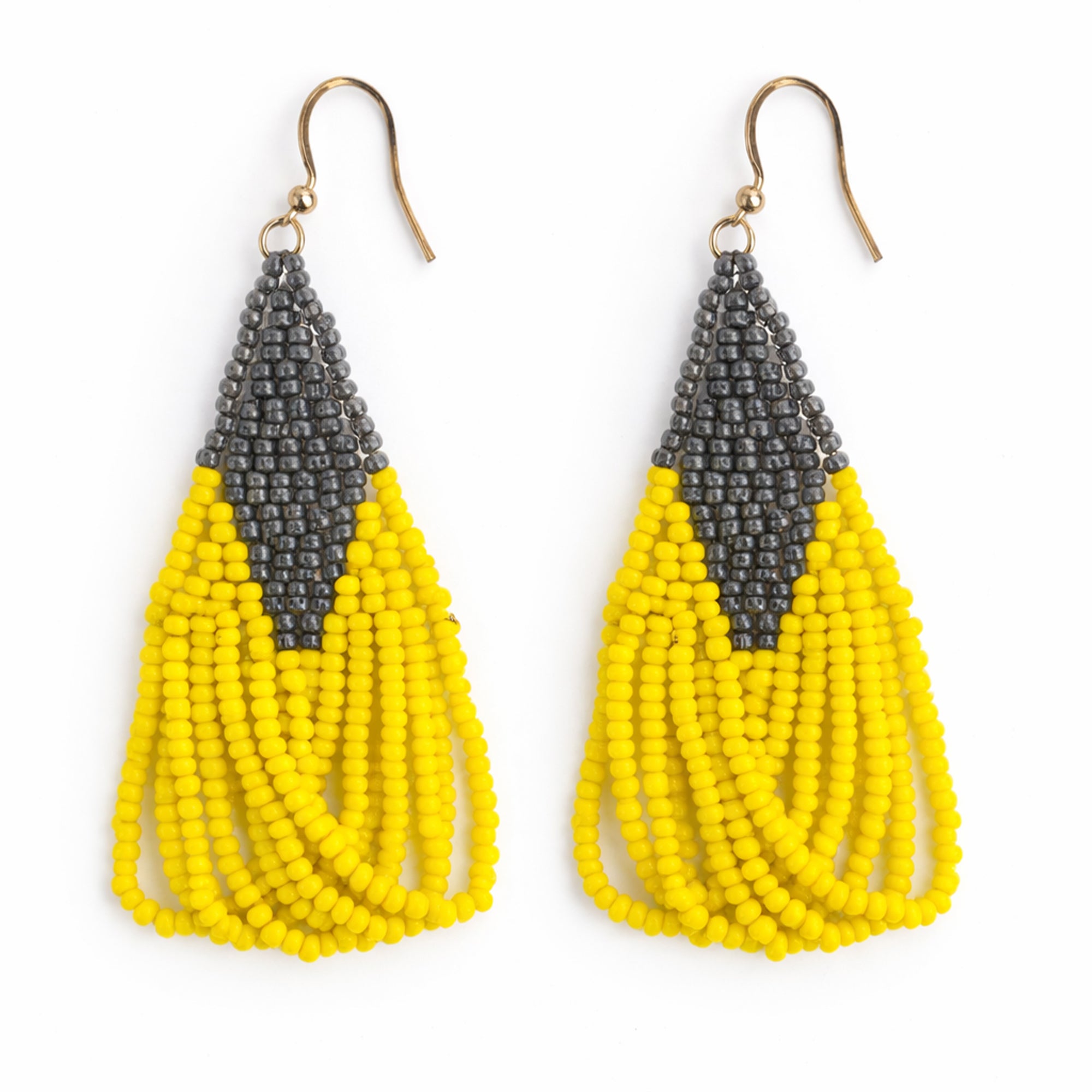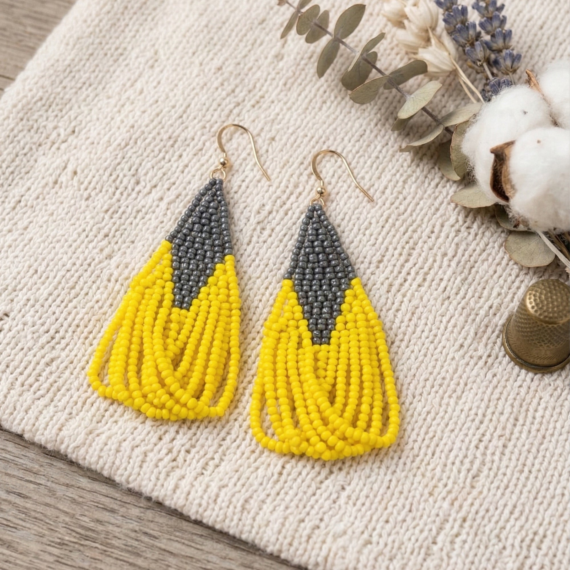 Stand out with these Yellow Grey Beaded Fringe Drop Earrings—striking grey-yellow triangle top with flowing yellow bead fringe offers dramatic dangle. Lightweight and versatile for sarees or dresses. Perfect for festive or party vibes.