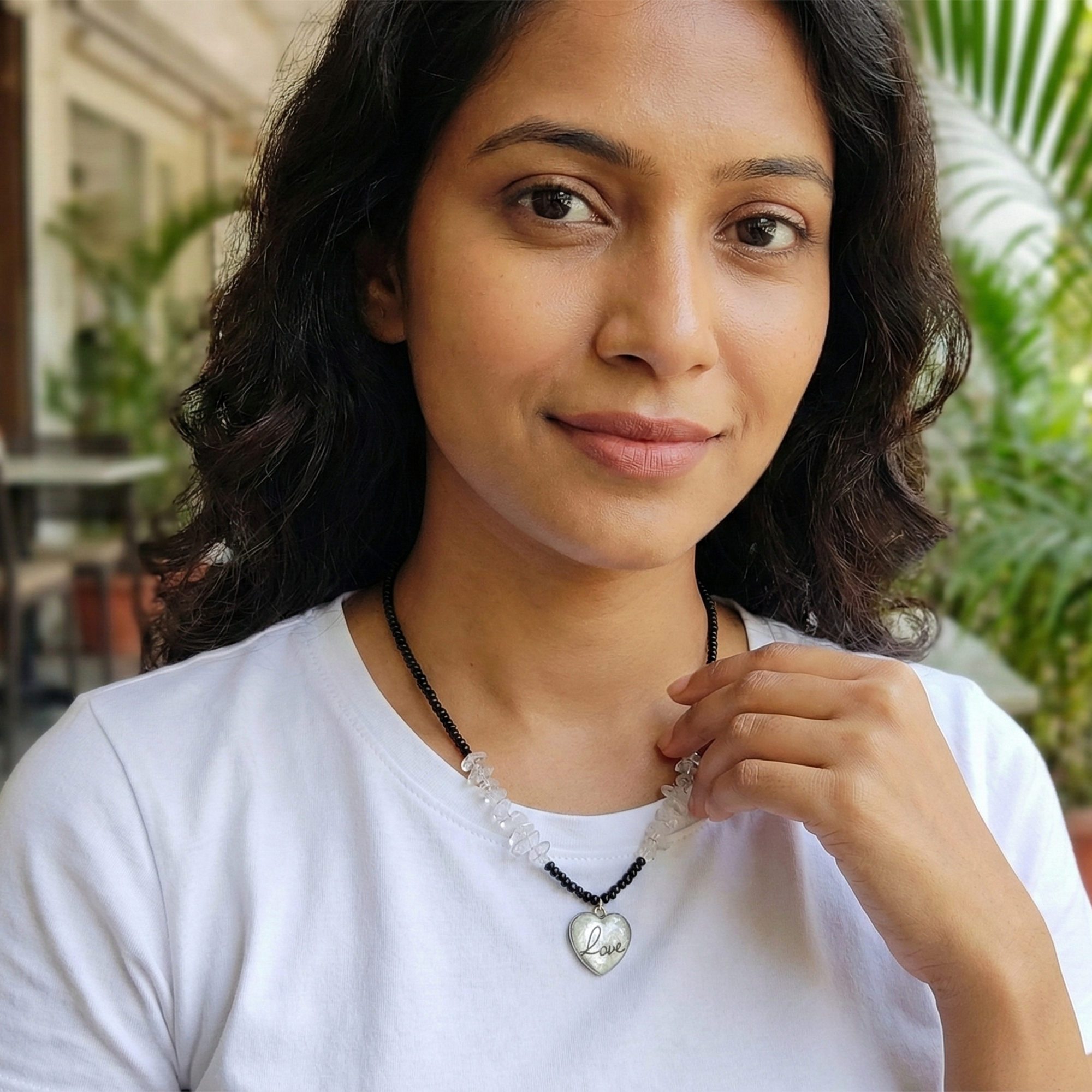 This elegant necklace features a strand of small black beads accented with a cluster of clear crystal-style chips at the center. Hanging from the center is an oval stone-look pendant that adds a subtle focal point without being too heavy. The gold-tone lobster clasp makes it easy to wear and remove, while the lightweight beads ensure comfortable all-day use. Designed to pair effortlessly with both Indian and Western outfits, this necklace is perfect for adding a touch of style to everyday looks or simple evening wear. It also makes a thoughtful gift for birthdays, festivals, or special occasions.
