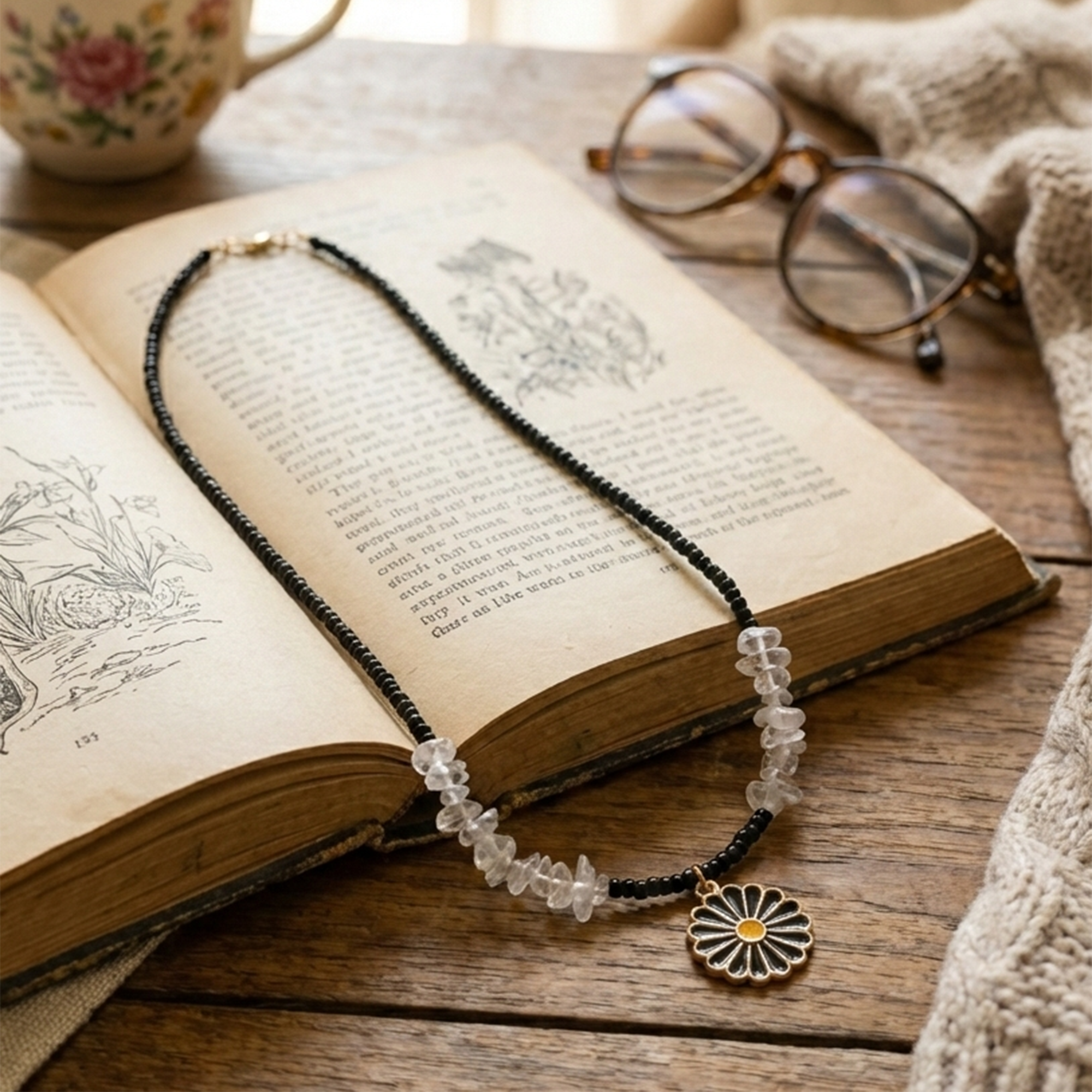 This elegant mangalsutra features a single strand of classic black beads enhanced with shimmering white crystal beads on both sides, creating a modern yet traditional look. At the center hangs a floral round pendant that adds a beautiful focal point, making it suitable for both daily use and special occasions. The necklace is lightweight and comfortable to wear throughout the day, while the gold-tone hook clasp ensures easy and secure fastening. Its simple yet stylish design pairs well with ethnic outfits like sarees and suits, as well as Indo‑western wear, making it a versatile addition to your jewelry collection. Ideal as a gift for weddings, anniversaries, festivals, or as a thoughtful present for your loved one.