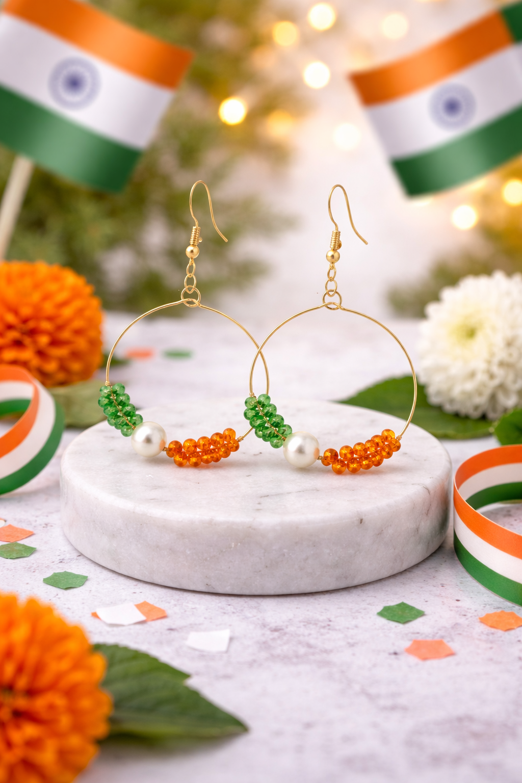 Add a splash of color and tradition to your jewelry collection with these handcrafted hoop earrings. Featuring a delicate gold-toned wire frame, each earring is meticulously adorned with faceted green and orange beads that catch the light beautifully. At the center sits a lustrous white pearl, providing a classic contrast to the vibrant hues. These lightweight earrings are designed for comfort, featuring a secure fish hook closure, making them an ideal choice for long-lasting wear during festivals, weddings, or brunch outings.