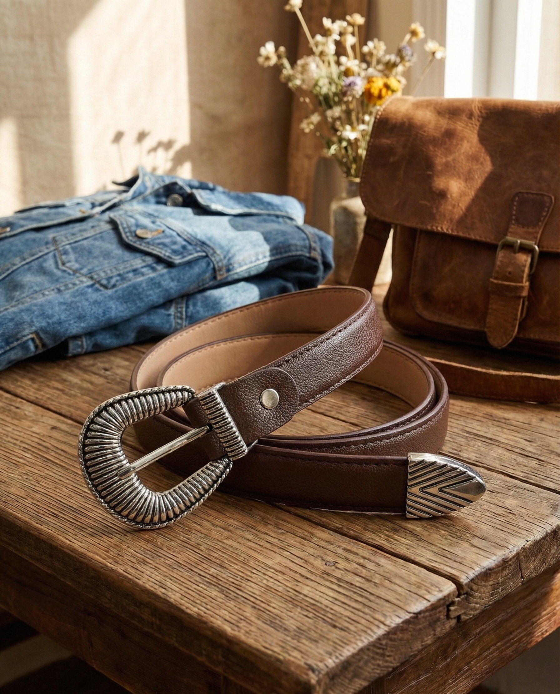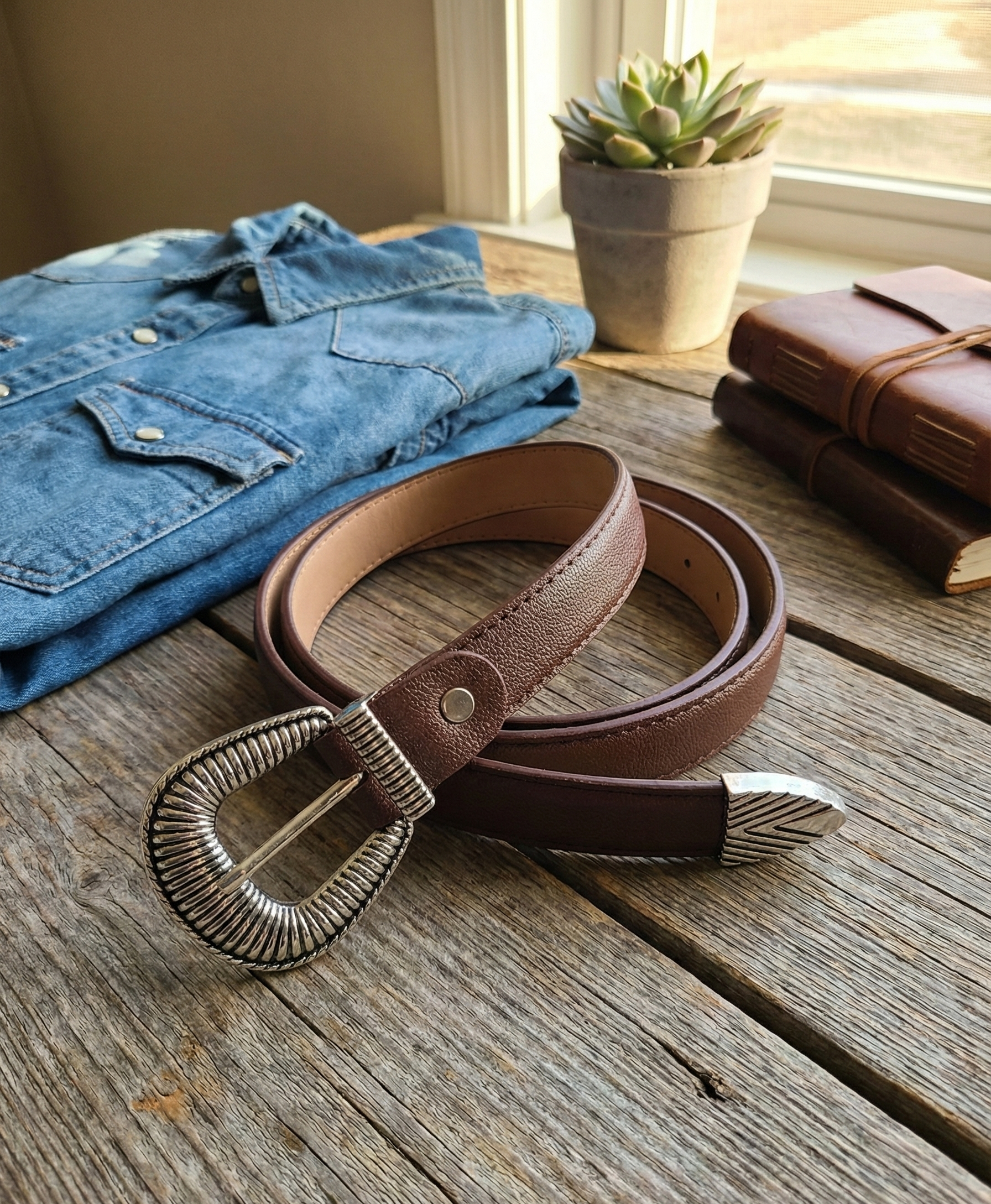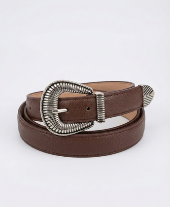 This rugged yet sophisticated belt from OMID Luxury Lifestyle Accessories channels a classic Western aesthetic. Crafted from rich chocolate brown faux leather, the belt is accented with antique-style silver hardware. It features a beautifully engraved Western buckle, a matching metal keeper, and a decorative metal tip at the end of the strap. This accessory is perfect for adding a touch of "Cowgirl Core" or boho charm to your favorite jeans and skirts.