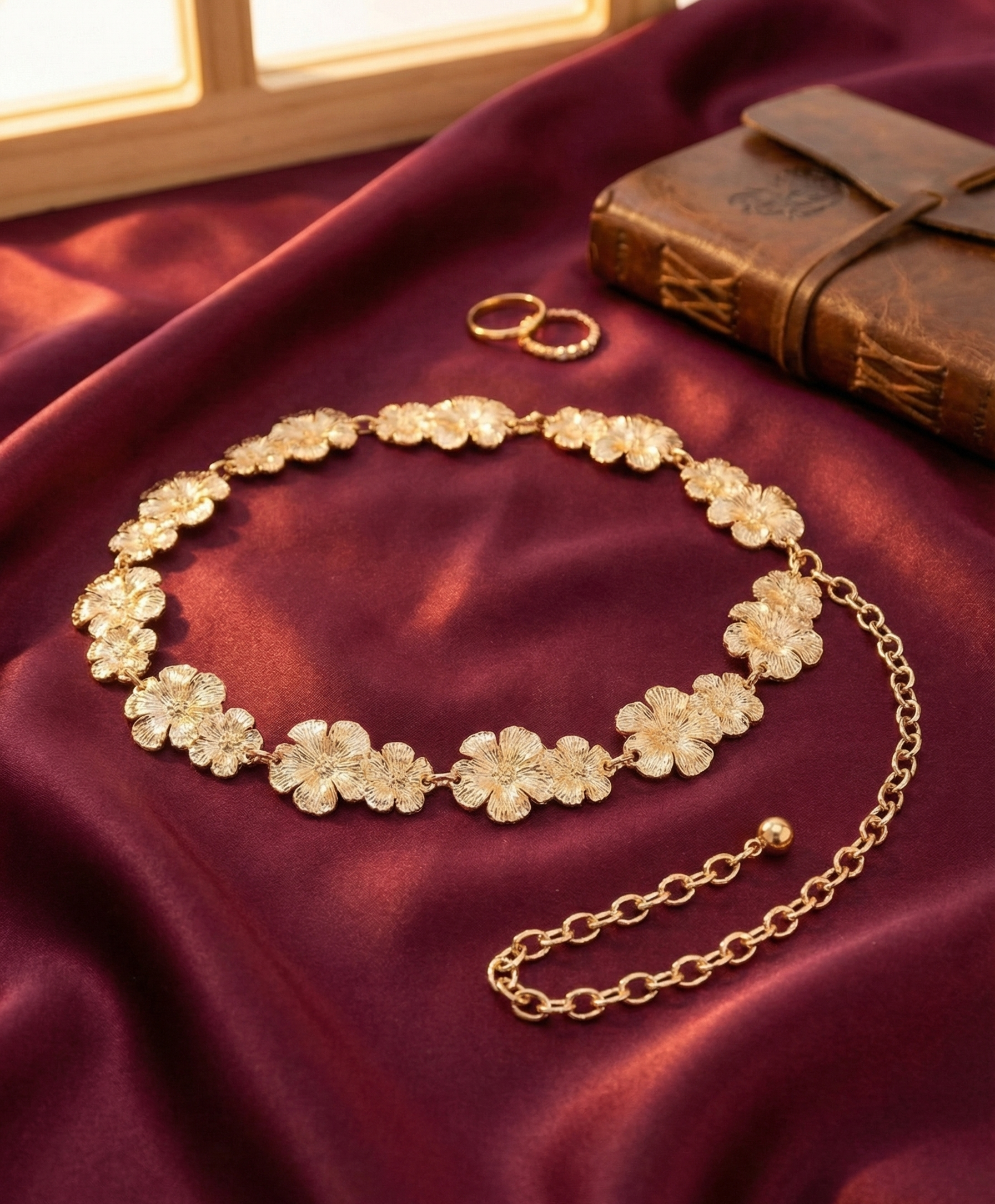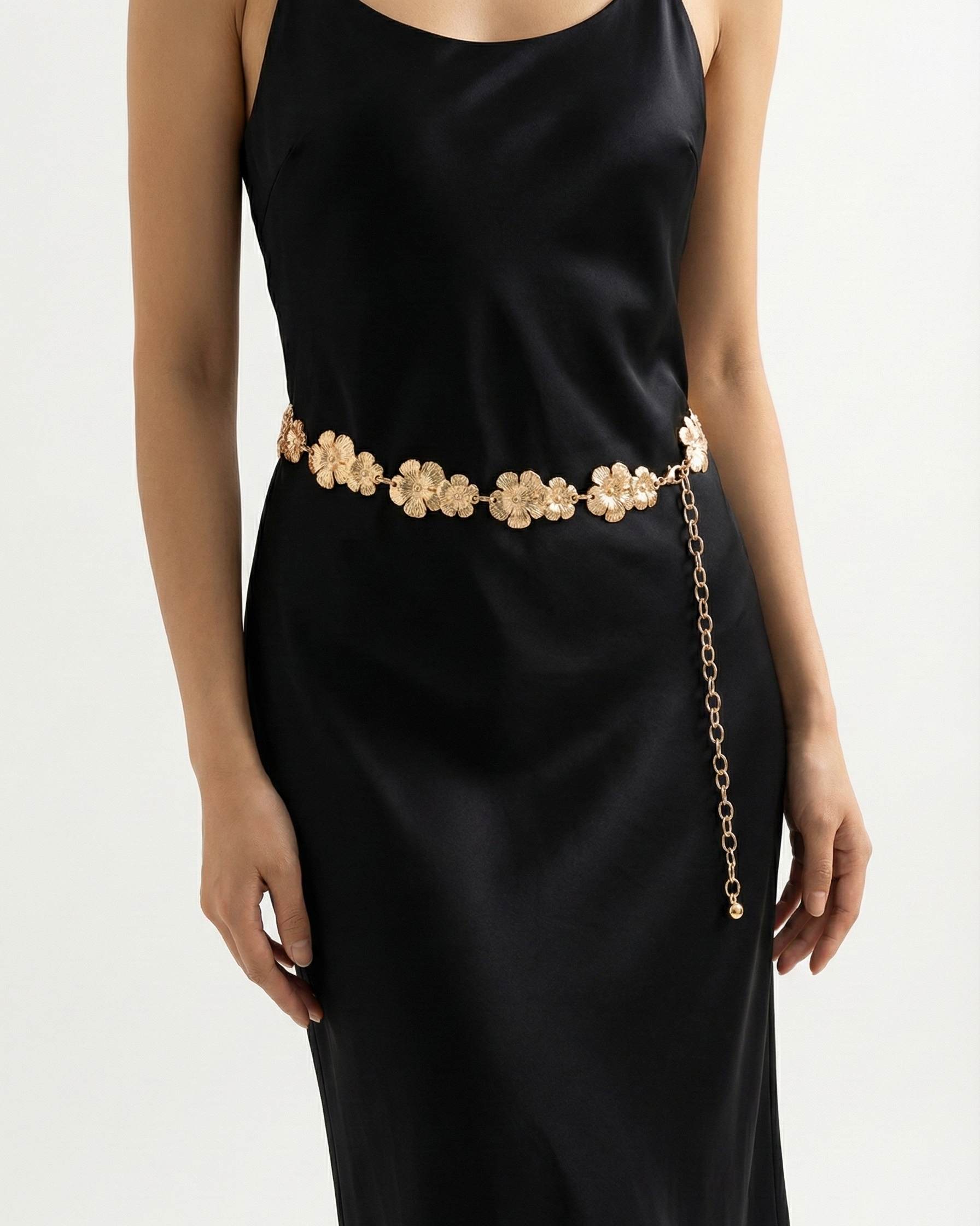 This charming and feminine chain belt from OMID Luxury Lifestyle Accessories brings a romantic flair to your wardrobe. The belt features a series of linked floral motifs, where each segment consists of a duo of textured gold flowers. This decorative section transitions into a classic cable or curb chain, offering adjustable length and a secure fit. Whether draped over a summer dress, a saree, or high-waisted trousers, this floral belt adds a delightful touch of nature-inspired elegance.