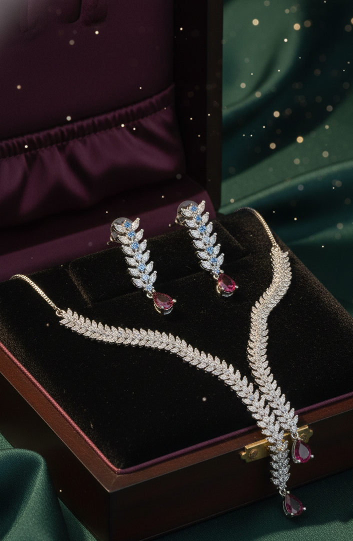 - Marquise-Cut Leaf Motif: The body of the necklace is composed of marquise-cut American Diamonds arranged in a delicate leaf or vine pattern for maximum sparkle.