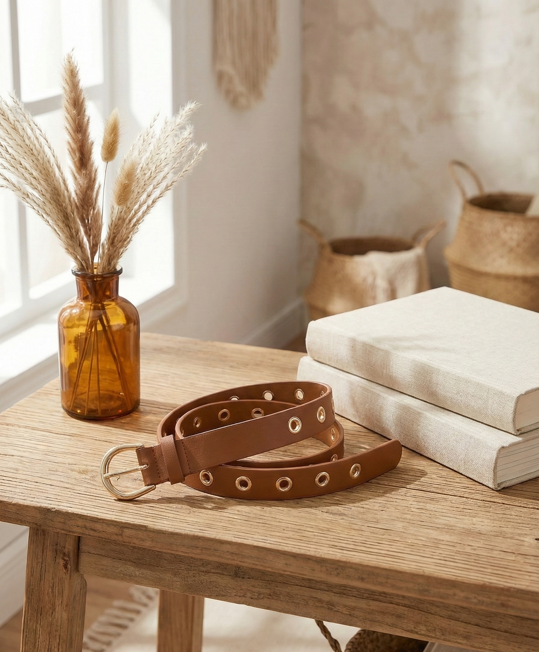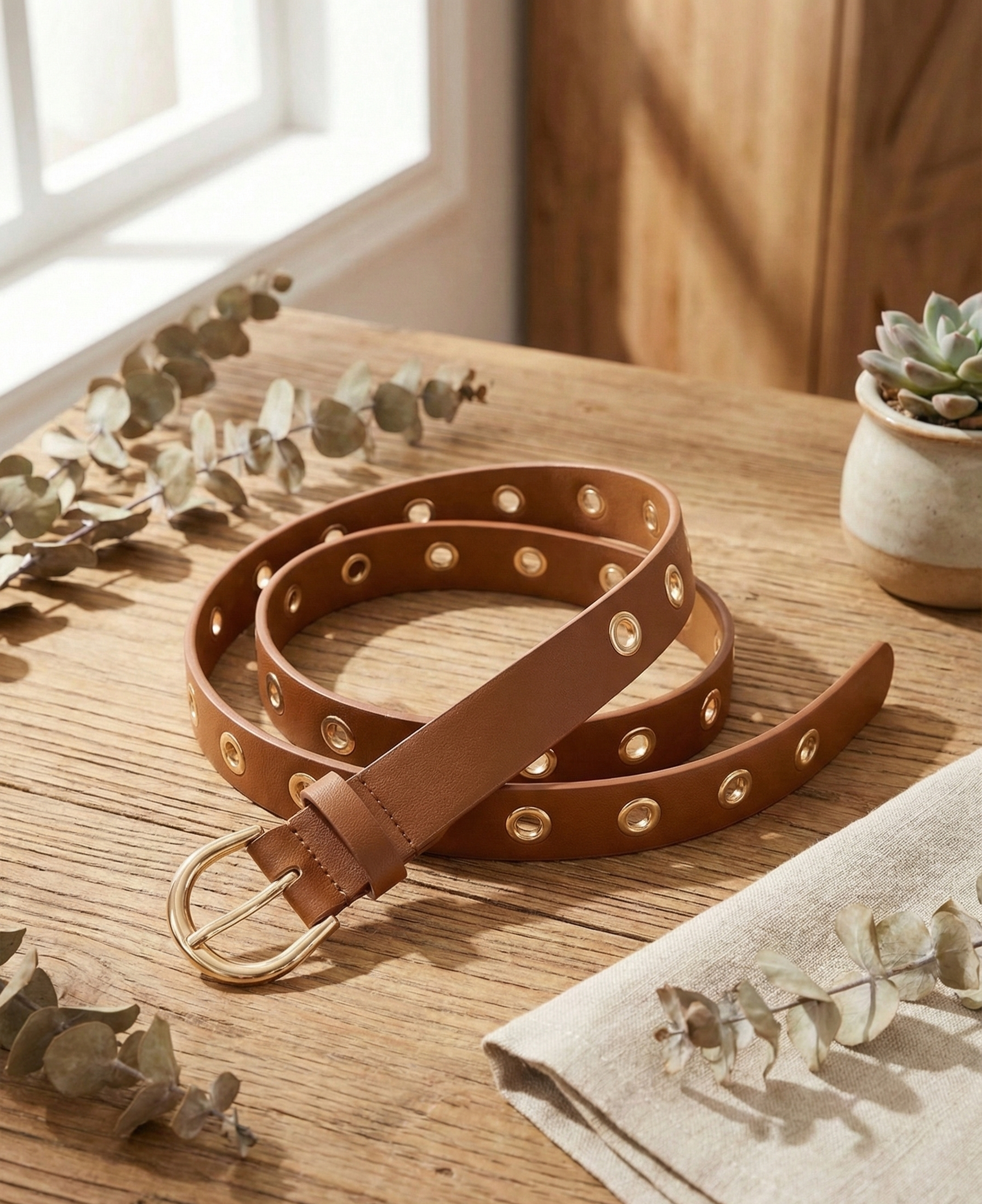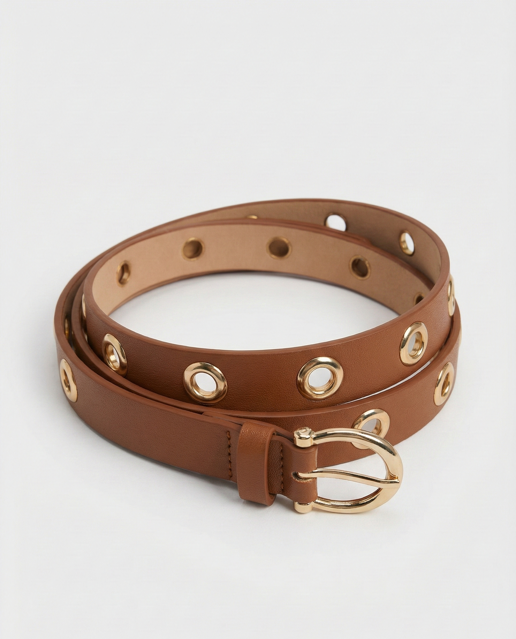 | Item Name | Luxury Tan Faux Leather Belt With Gold Round Grommets |
