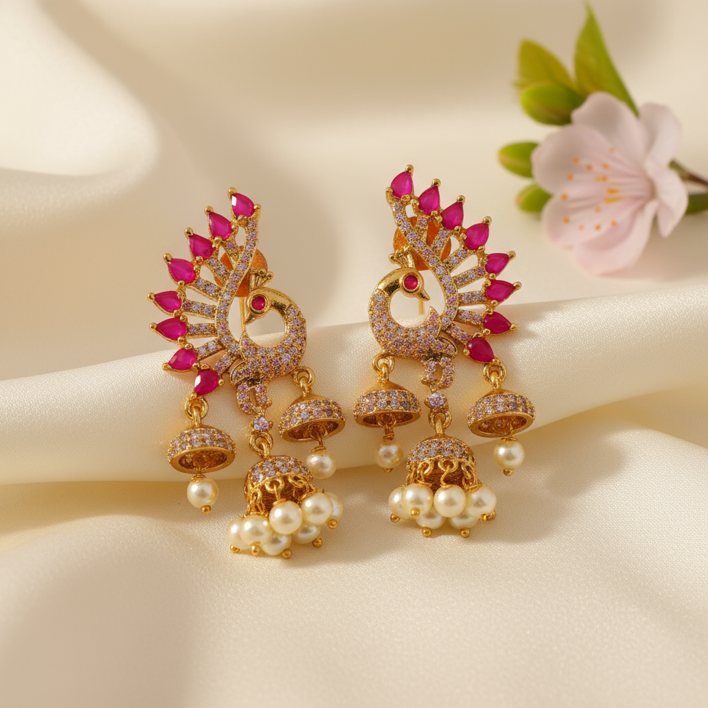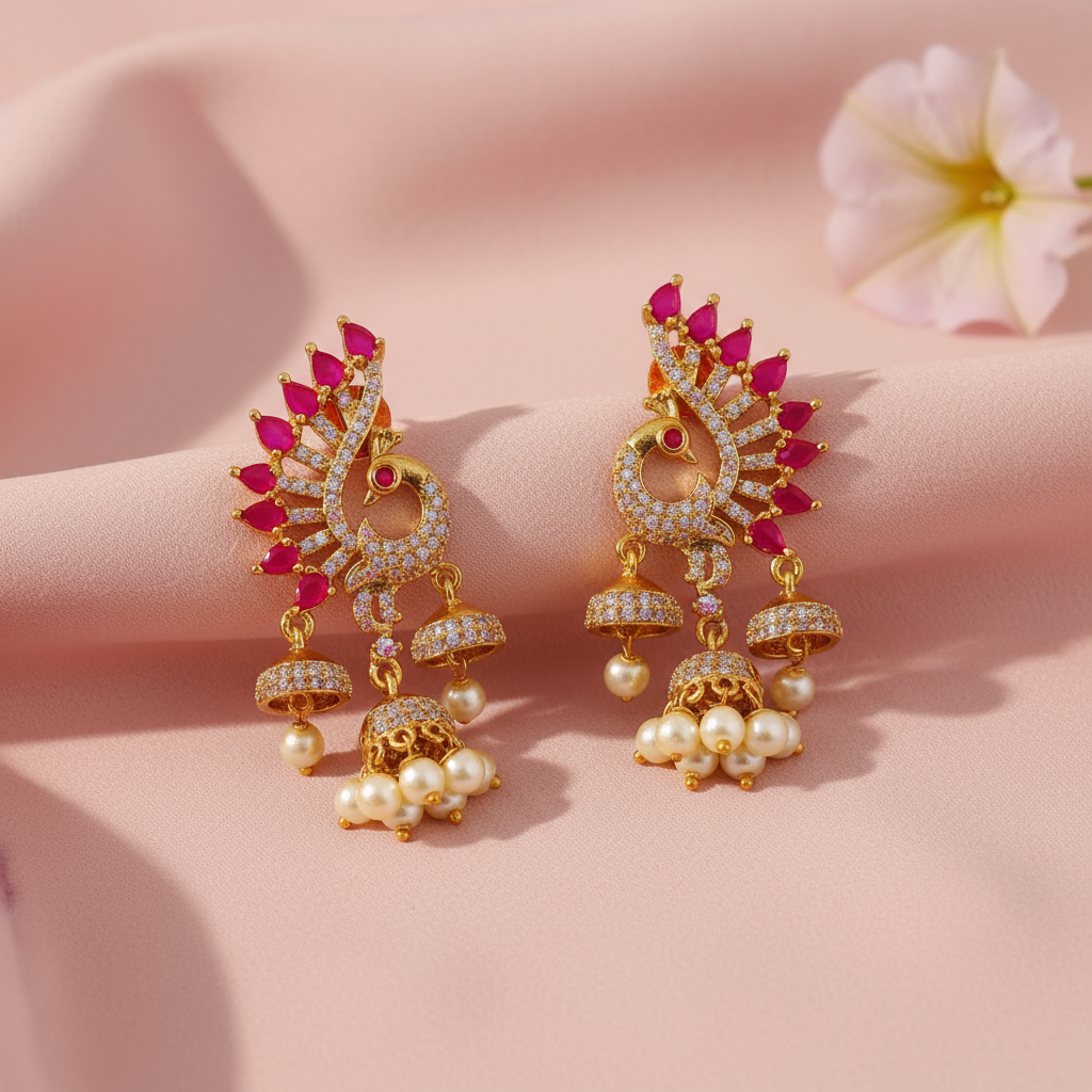 These elegant gold-plated jhumka earrings feature a classic bell-shaped design highlighted by vibrant pink stones and lustrous pearl drops, embodying the rich heritage of traditional Indian jewelry. Ideal for weddings, festive occasions, and cultural celebrations, these earrings effortlessly elevate any ethnic or fusion ensemble. The intricate craftsmanship, shimmering finish, and comfortable push-back closure make them perfect for prolonged wear and style versatility. Pair them with sarees, lehengas, or even modern outfits for a stunning look.