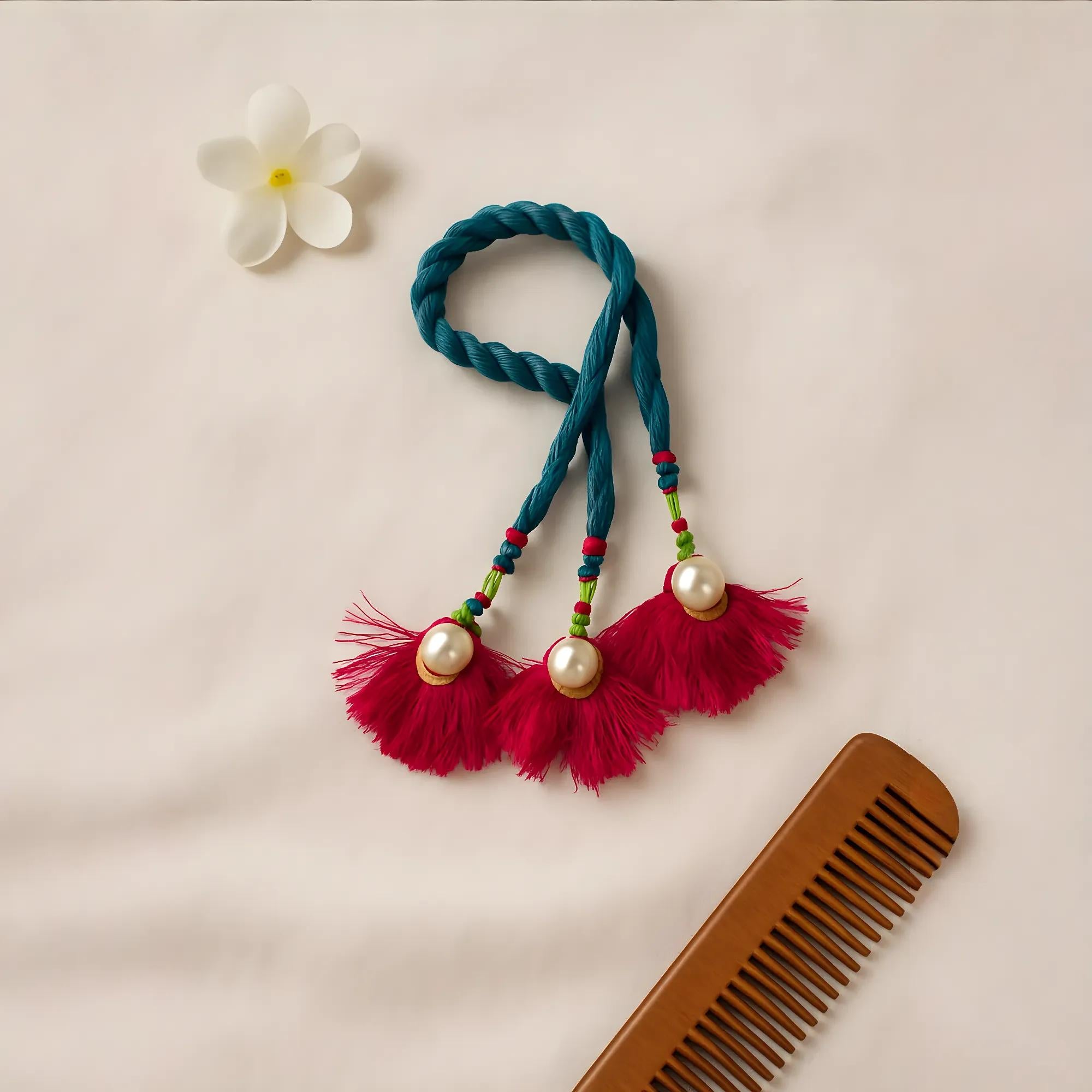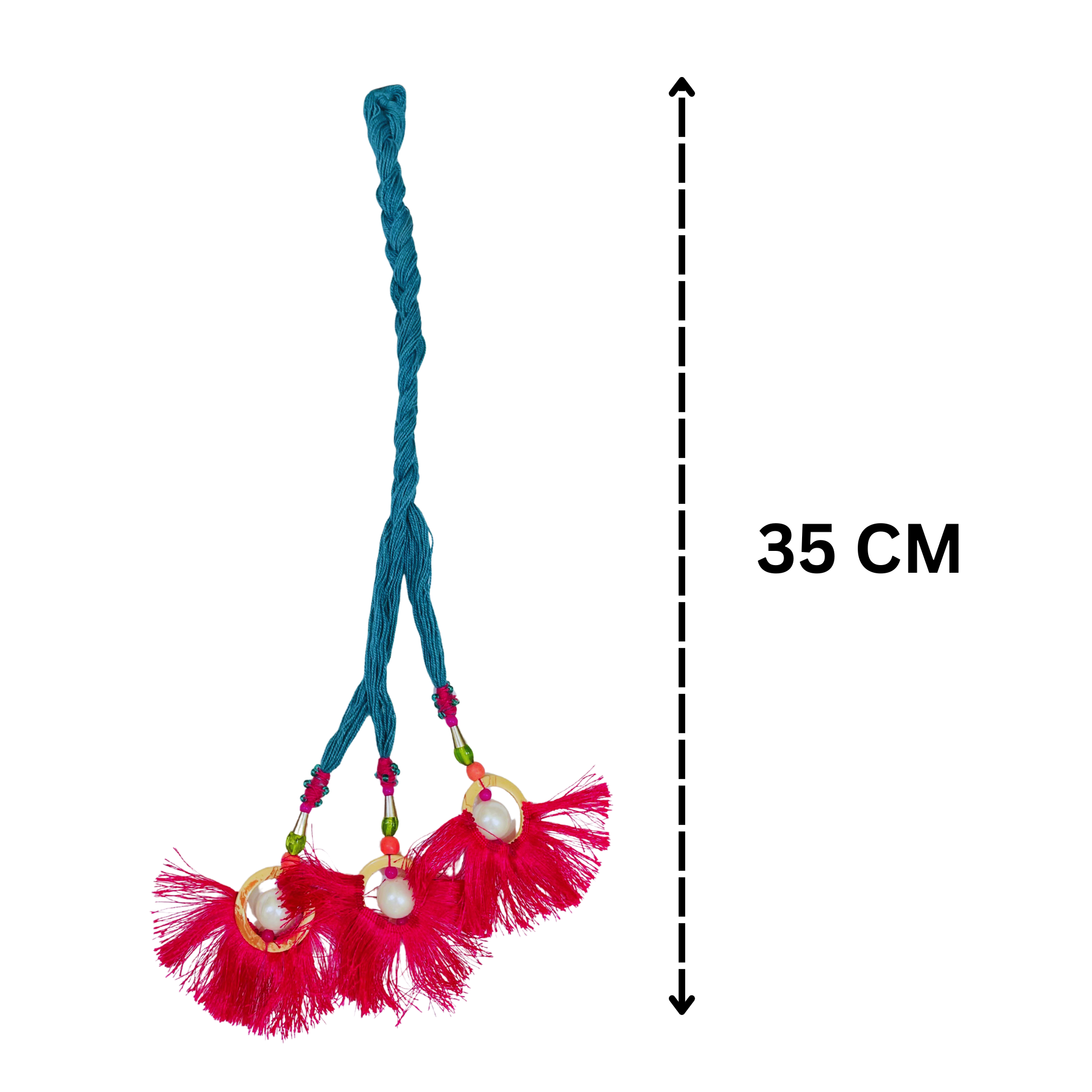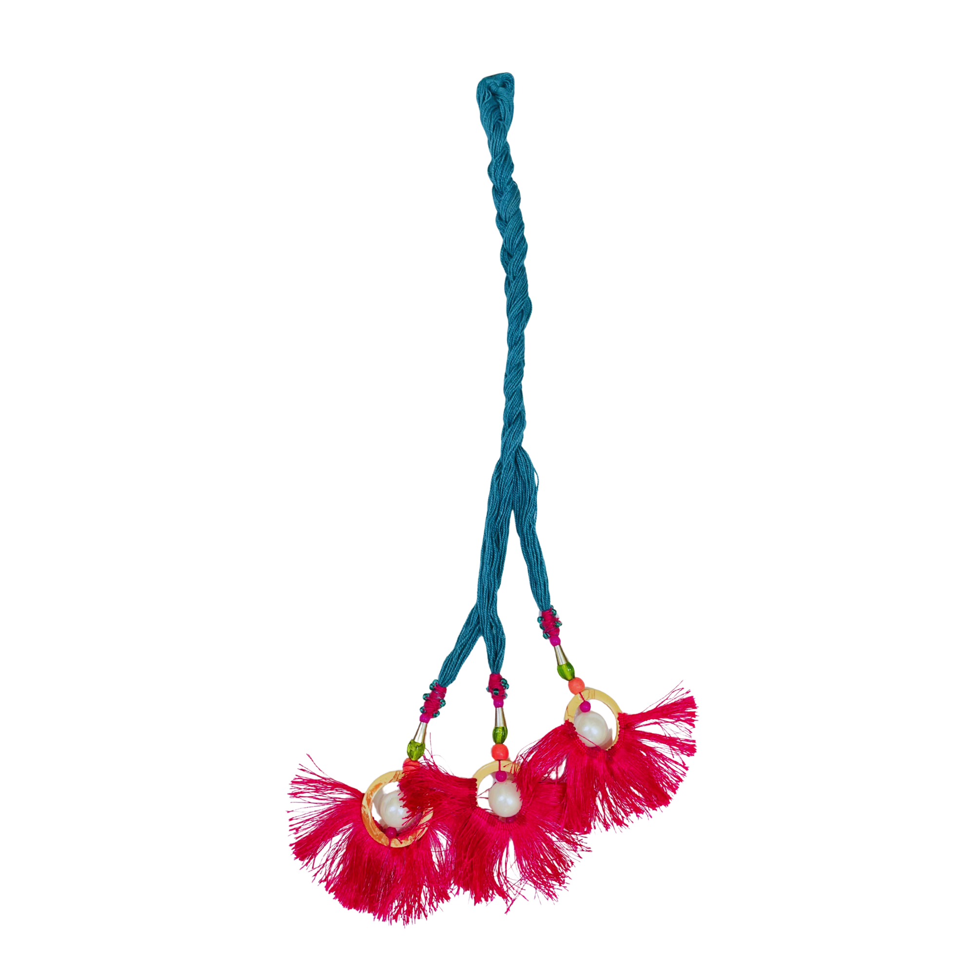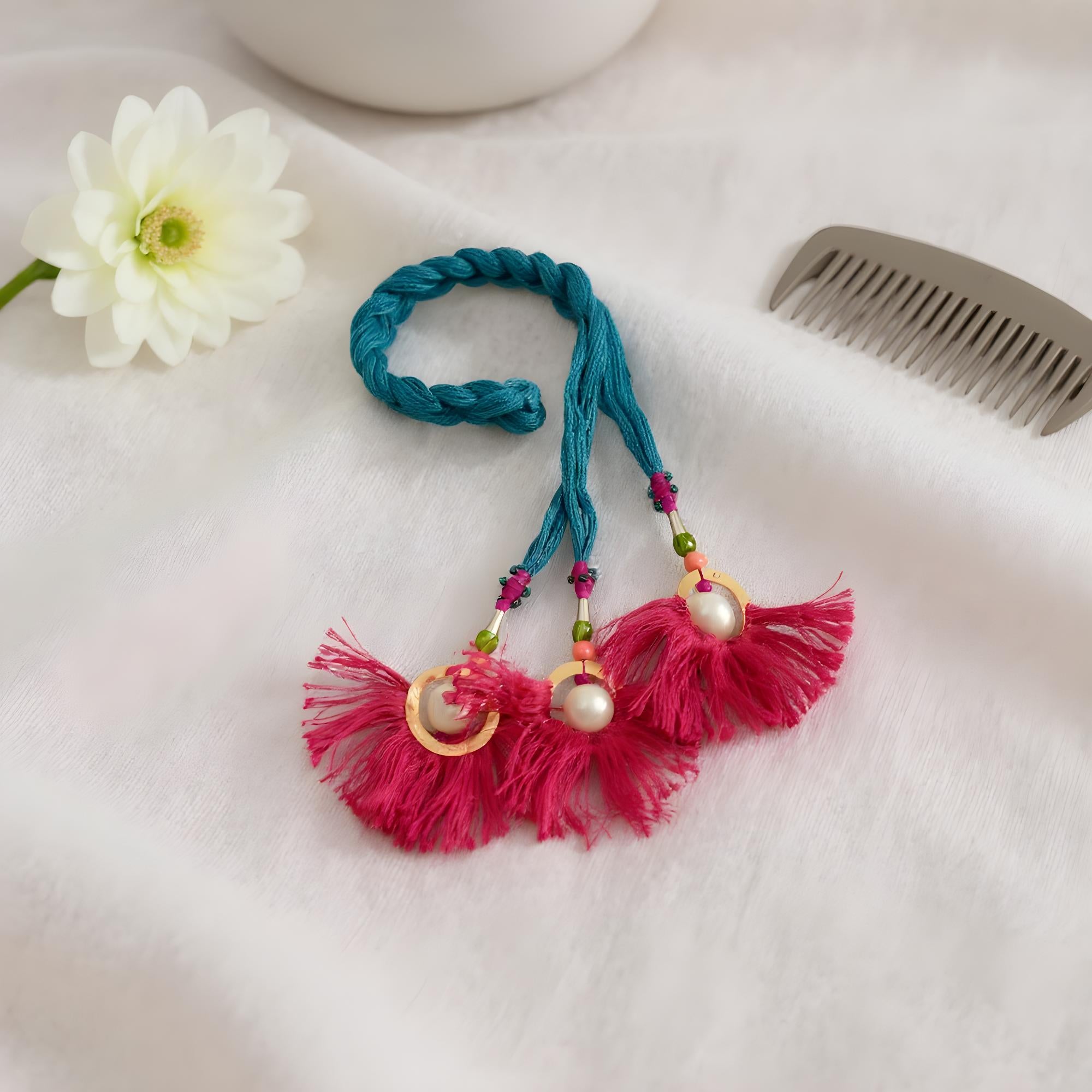 This handmade Punjabi Parandi is a traditional Indian hair accessory designed to enhance braid styles with vibrant color and festive flair. It features fine synthetic threads, contrasting pink tassels, and decorative beads, making it ideal for special occasions such as weddings, festivals, or ethnic celebrations. Lightweight and easy to use, it matches a variety of outfits and is suitable for all hair types. The durable craftsmanship ensures it can be worn comfortably throughout the day.
