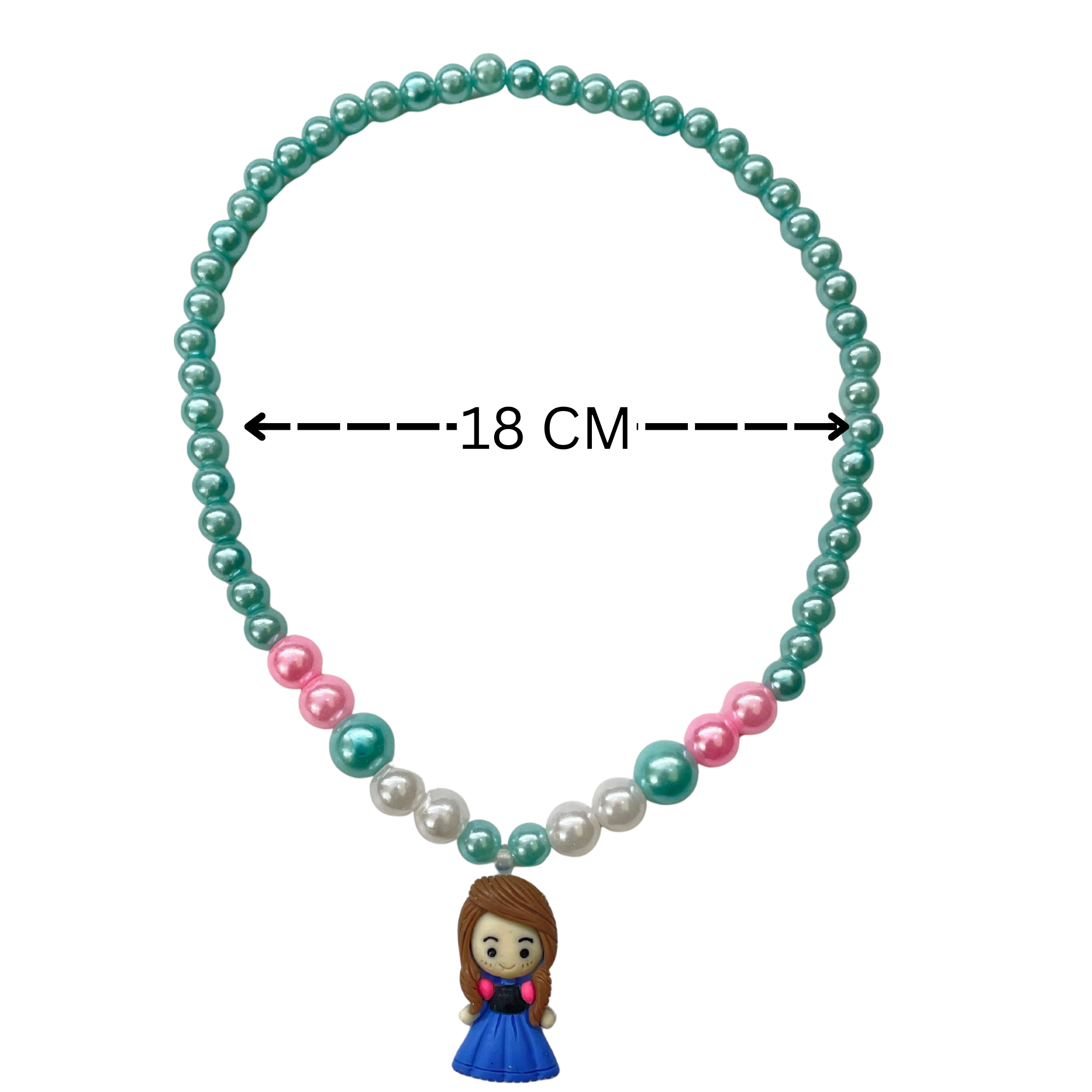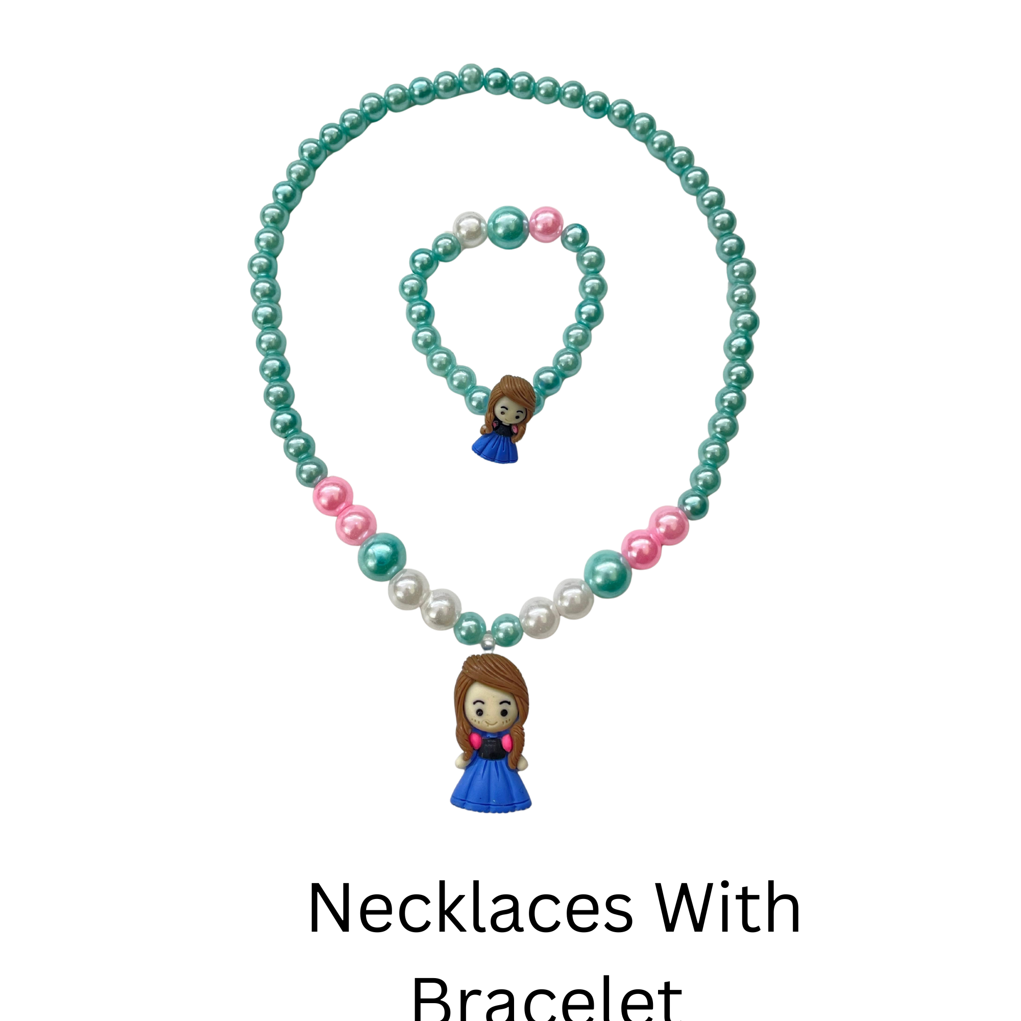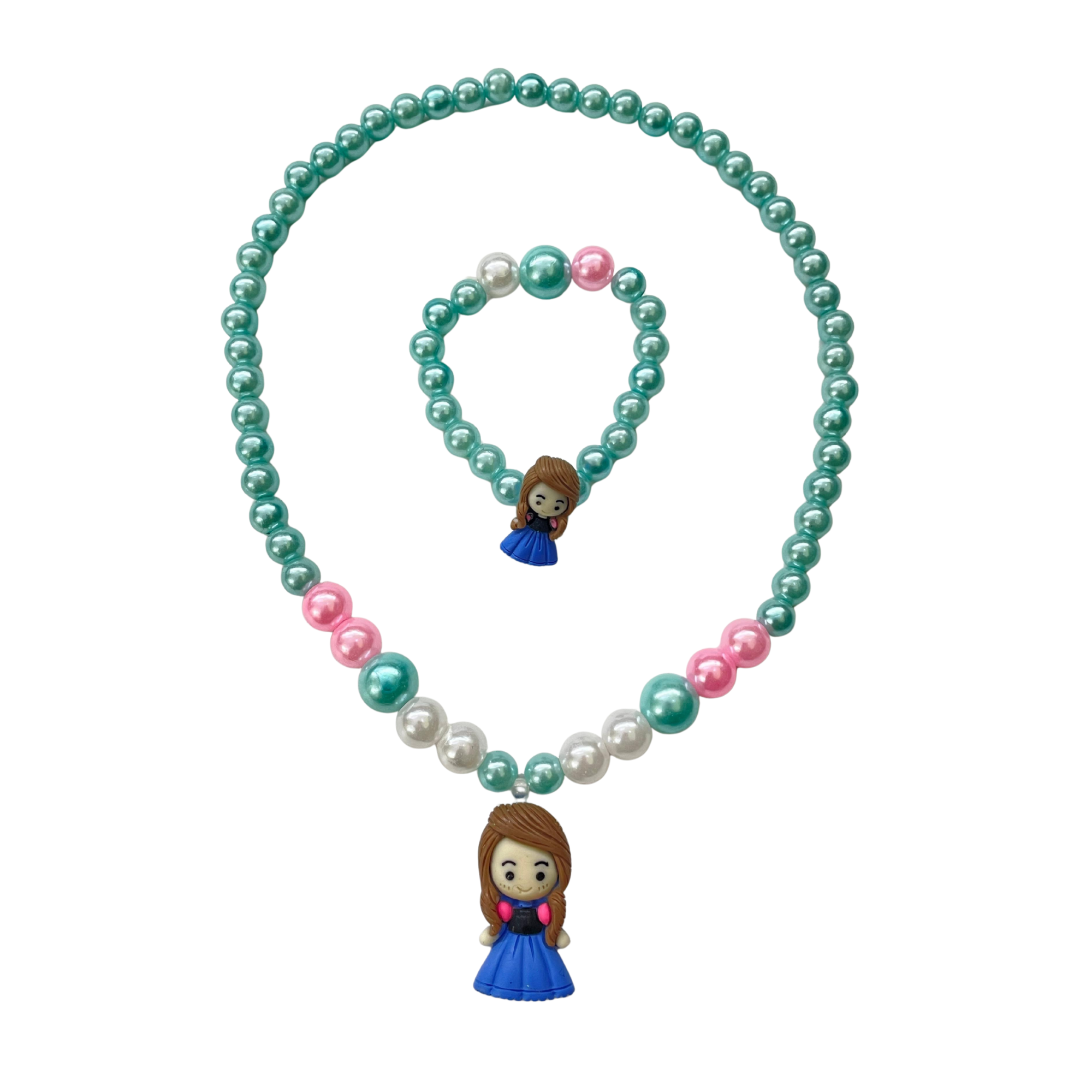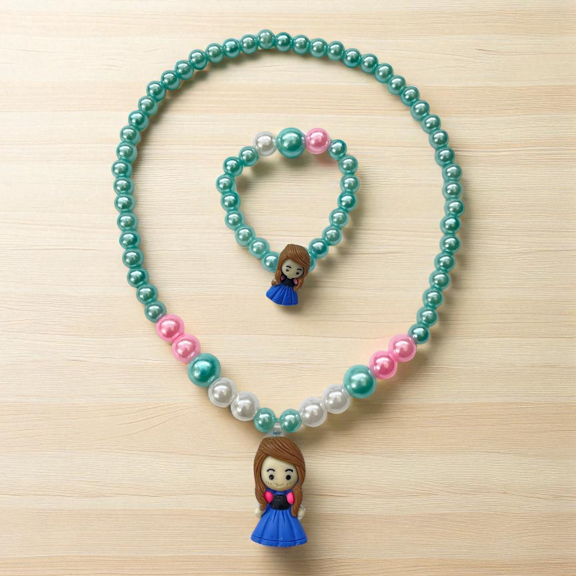 Make your little girl feel special with this cute and colorful beaded jewelry set! This set includes a necklace and bracelet, both featuring vibrant pearl-like beads in pink, green, white, and blue tones. The highlight is the adorable doll pendant that gives a playful and charming touch. Made from safe, non-toxic materials with stretchable elastic for comfort, this set is ideal for daily wear, pretend play, or party accessories. A wonderful gift for birthdays, dress-up parties, or just because!