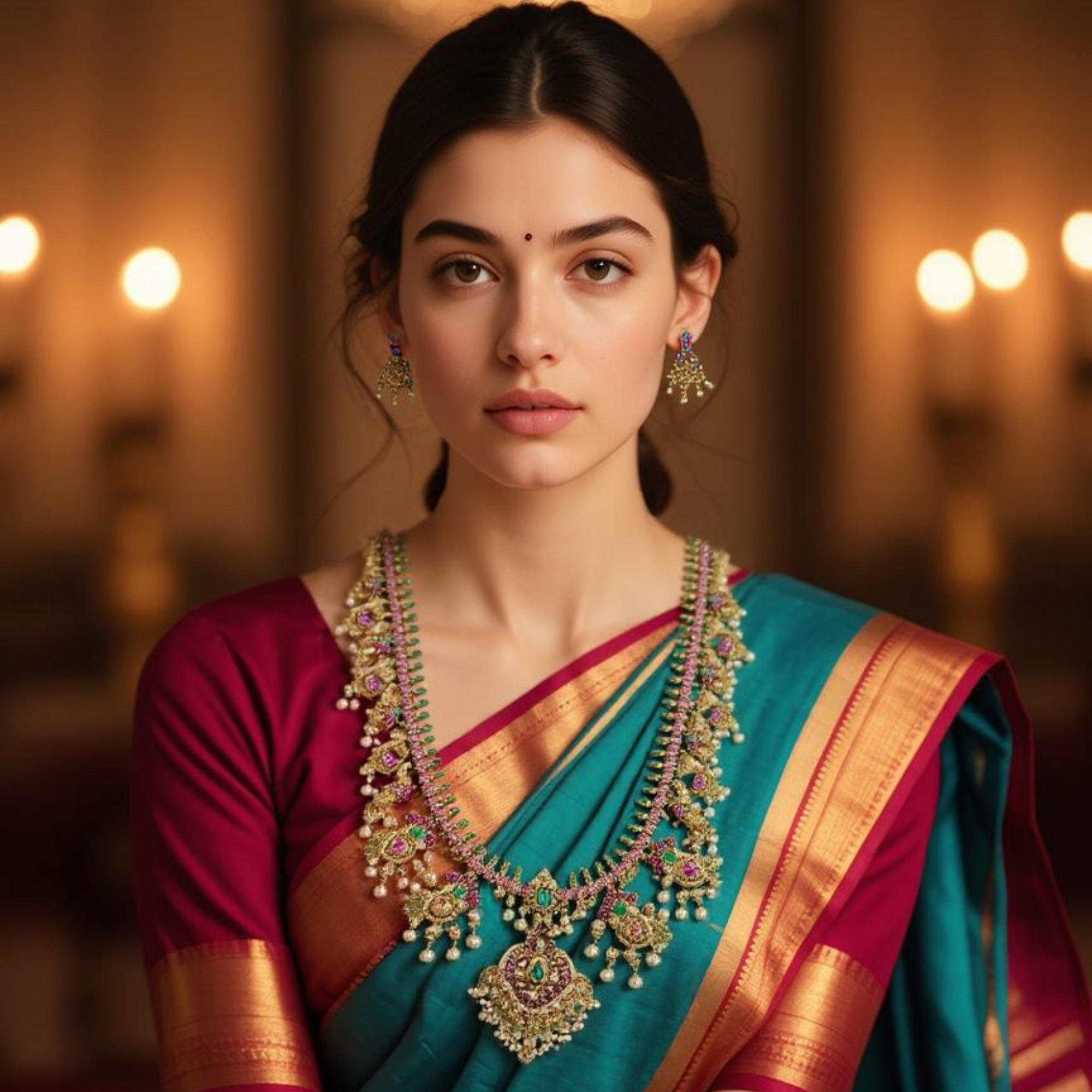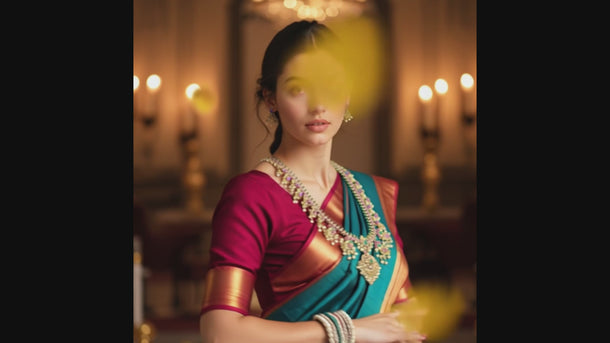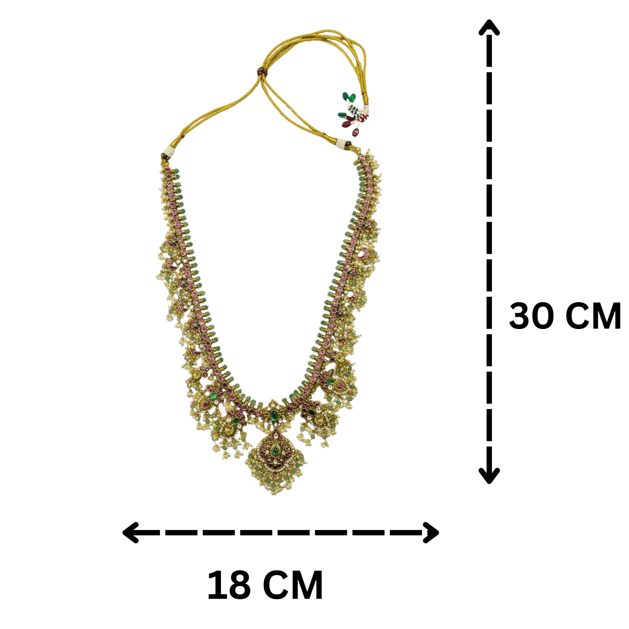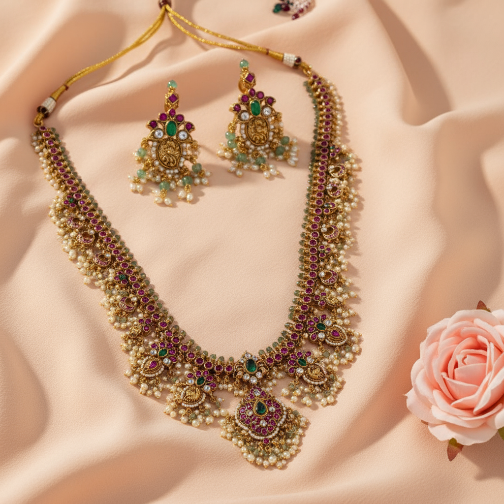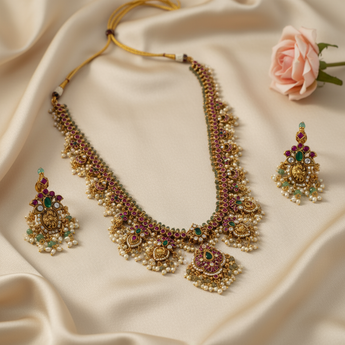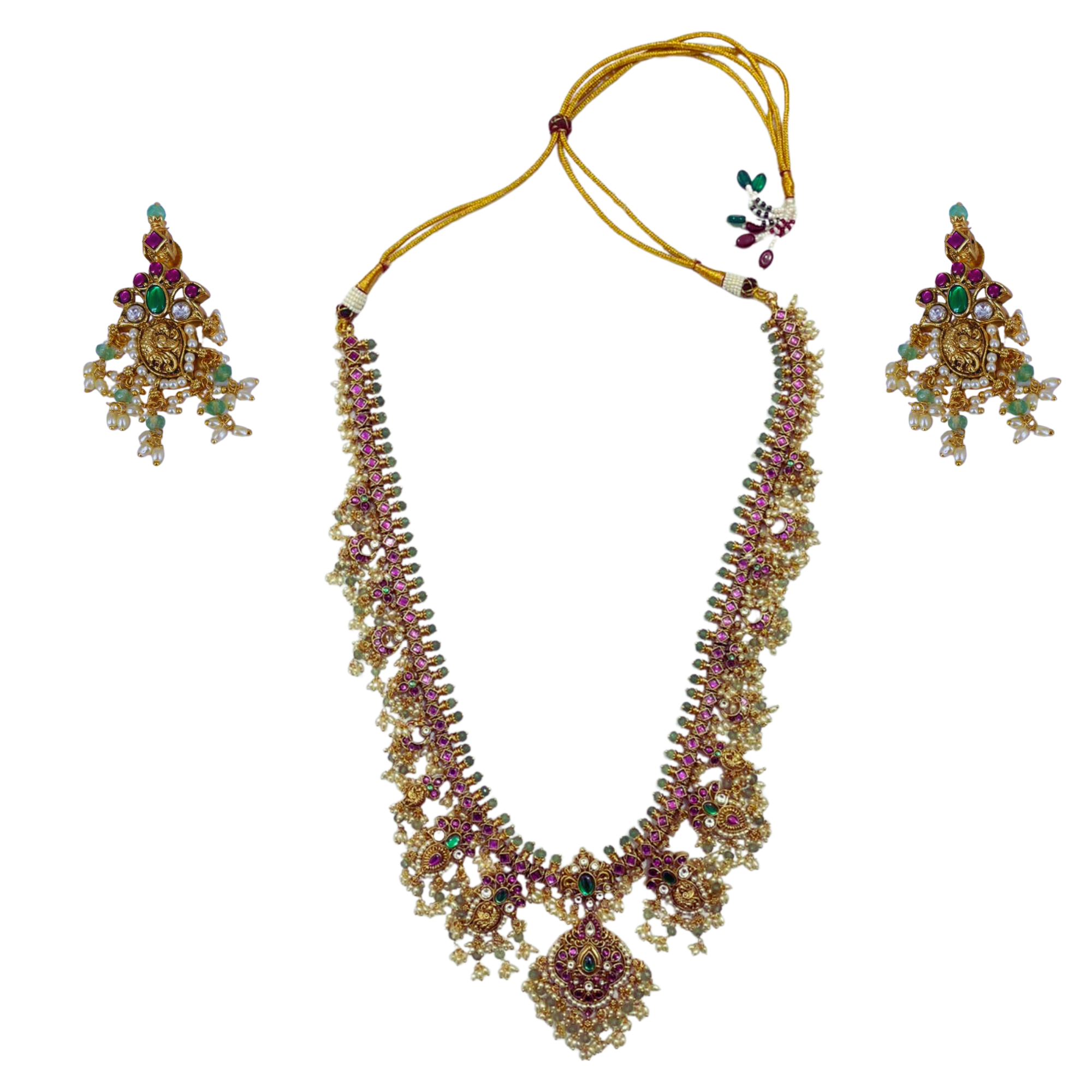 This stunning bridal necklace set features an intricately designed Kundan pattern with gold plating, highlighted by green and ruby stones and pearls. The adjustable thread closure ensures a comfortable fit, making it ideal for traditional wedding attire such as lehengas or saris. The matching earrings complete the regal look, ensuring that you stand out during important occasions like weddings, engagements, or festive celebrations. Expertly crafted, this set exudes elegance and sophistication for memorable events.
