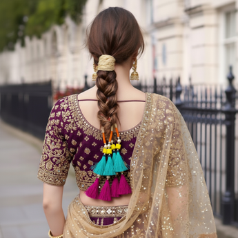 This traditional Parandi is a beautiful hair accessory handcrafted for special cultural events, especially suited for Punjabi attire. Made from high-quality yarn, the Parandi features vibrant green and pink tassels finished with yellow decorative beads and pearls. It is designed to tie at the end of braids, adding elegance and a splash of color to any hairstyle. The lightweight design ensures comfort throughout the day and is suitable for all ages. This Parandi makes an excellent gift for anyone looking to enhance their ethnic look for festivals, weddings, or other celebrations.