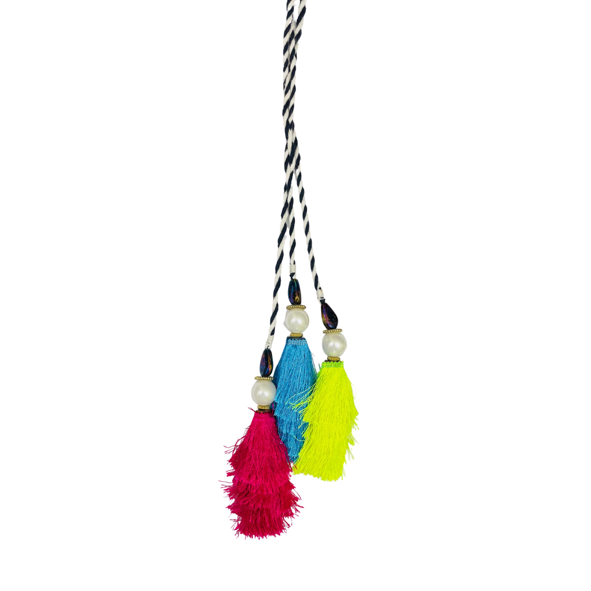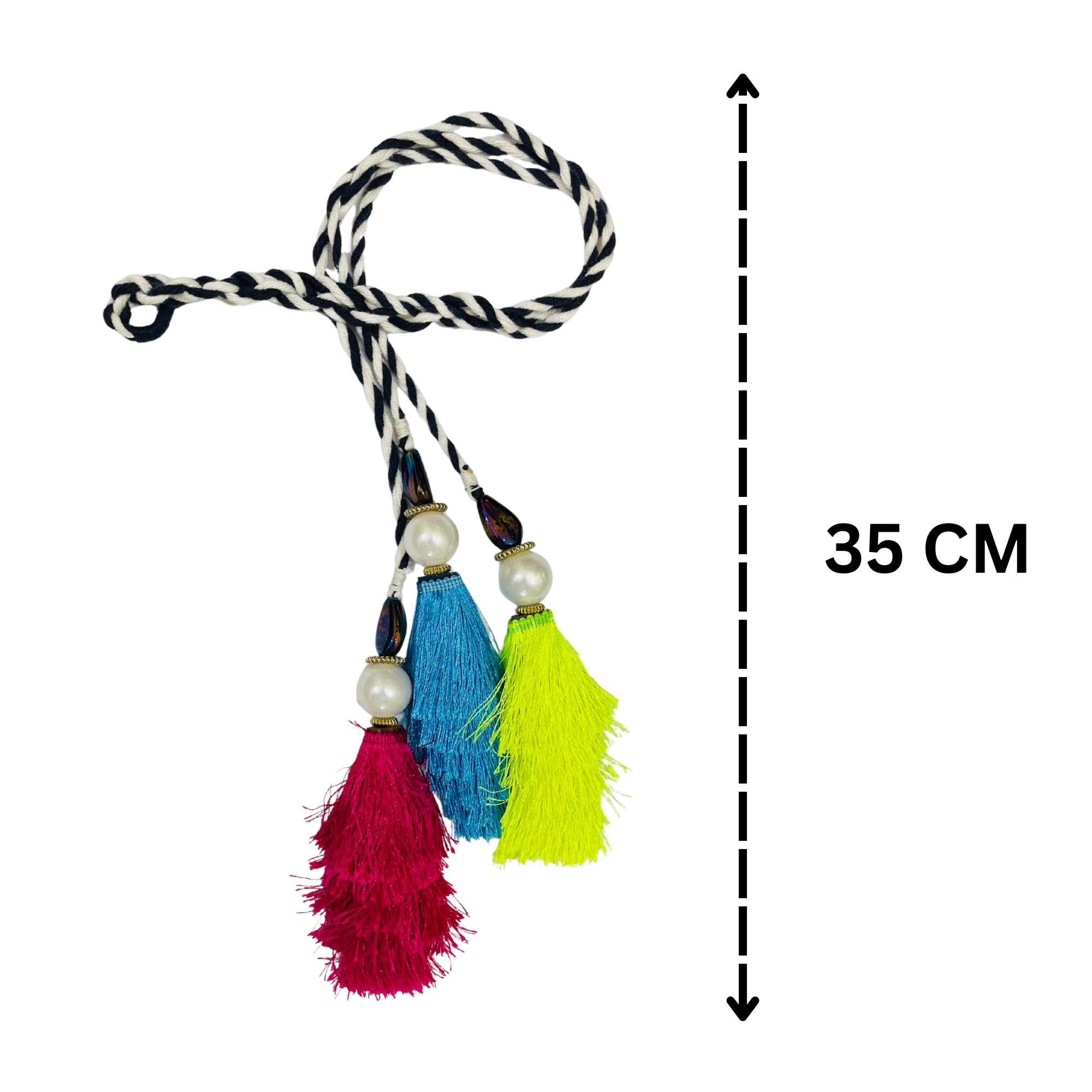 - Authentic Punjabi Parandi: Handcrafted multicolored tassels with elegant beads and faux pearls accented on a twisted black and white braid.