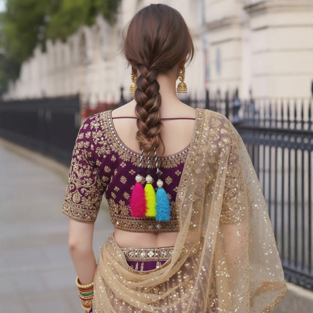 This authentic Punjabi Parandi is a traditional hair accessory designed to bring heritage and elegance to your hairstyle. Meticulously handcrafted by skilled artisans, it features vibrant silk tassels in neon yellow, blue, and pink, combined with decorative pearls and beads. The sturdy, twisted black and white cord makes it easy to attach to braids or ponytails, instantly elevating your look for weddings, festivals, and everyday ethnic fashion. Lightweight and comfortable, this Parandi is suitable for all hair types and makes an excellent gift for those who celebrate Indian culture and tradition.