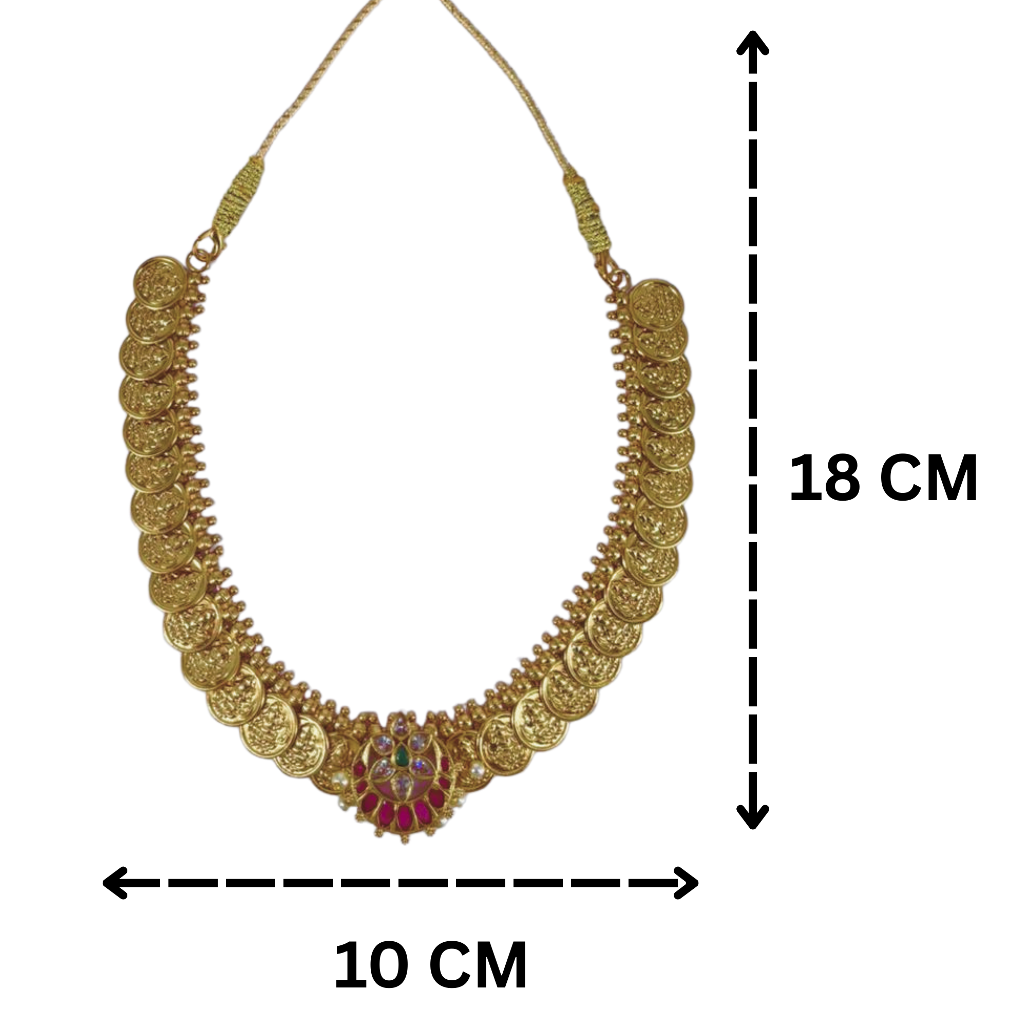 This South Indian bridal jewelry set features a traditional antique gold-plated necklace with matching jhumka earrings, adorned with Kemp stones and imitation pearls for an opulent festive look. Inspired by temple jewelry designs, the set combines elegance with cultural heritage, making it an ideal choice for weddings, engagements, and special occasions. The necklace is lightweight and comfortable, with a secure adjustable closure to ensure a perfect fit with any traditional attire like sarees and lehengas. The earrings offer a classic finish with easy-to-wear push-back closures. The jewelry retains its shine and luster with proper care.