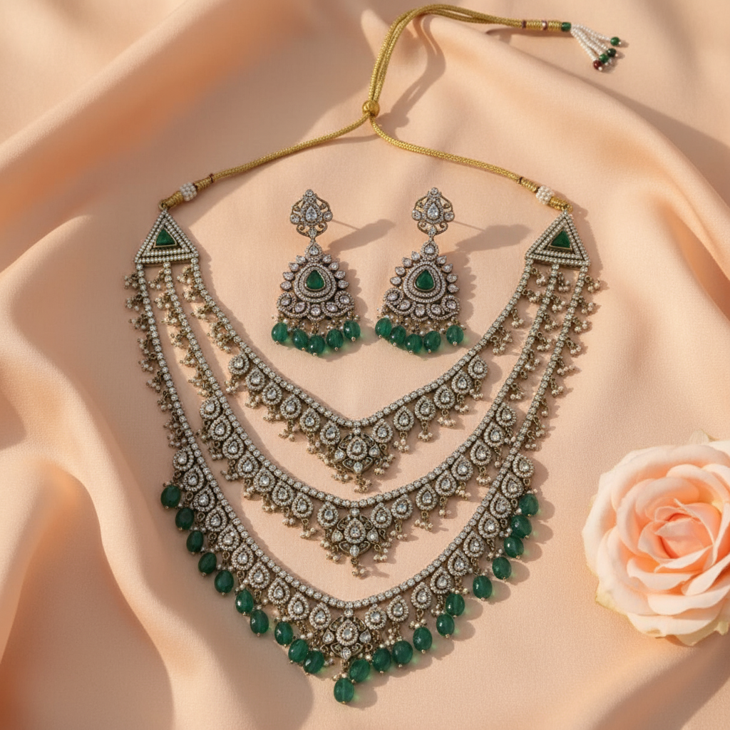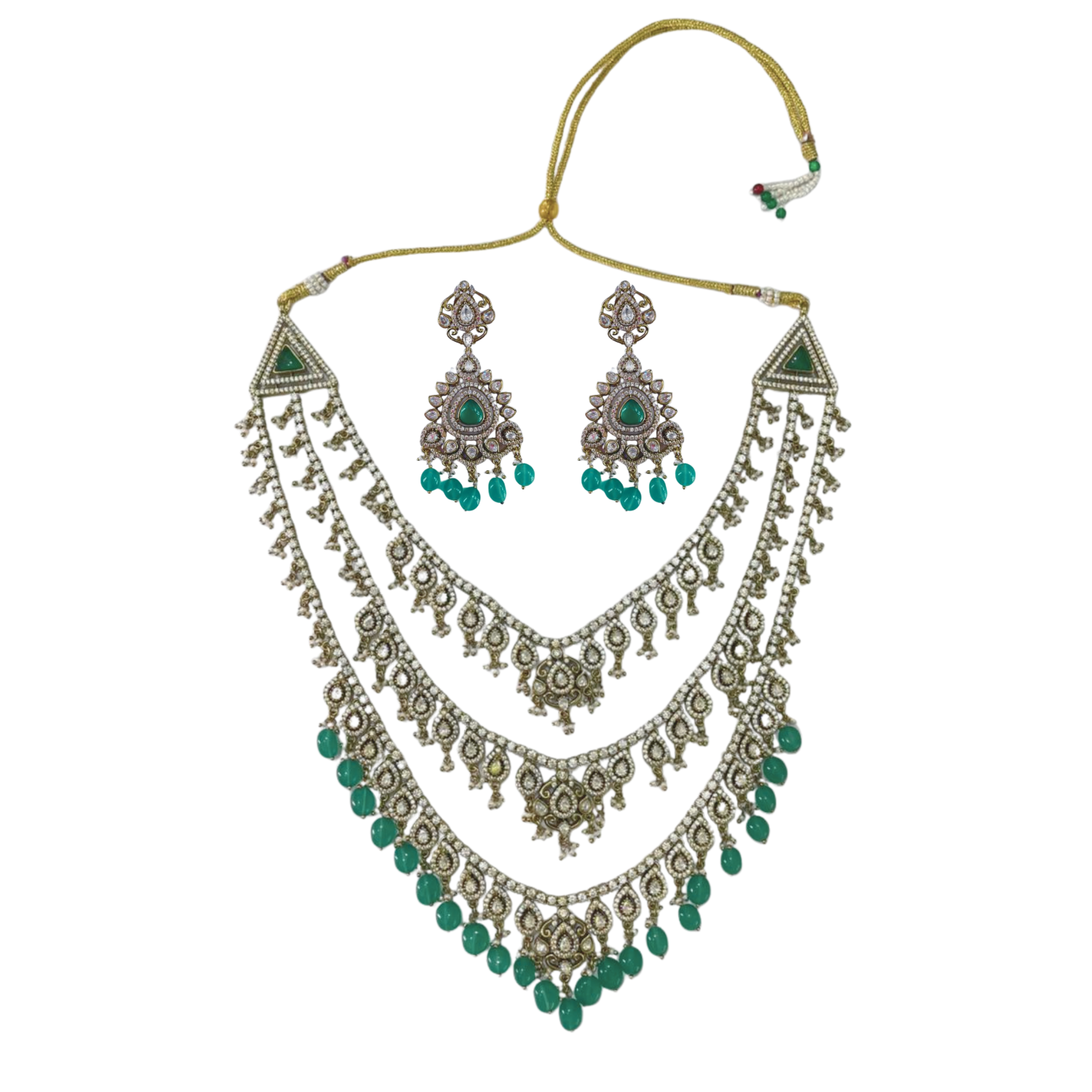 - Traditional multi-layer necklace and earrings set with green stones and pearls for women.